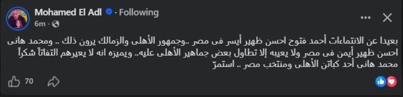 كما أبدى محمد العدل دعمه للاعب محمد هاني، مشيرًا إلى أنه أفضل ظهير أيمن في مصر، وأن الانتقادات التي يتعرض لها من بعض الجماهير لا تقلل من قيمته الفنية، وأضاف أن ما يميز اللاعب هو تركيزه داخل الملعب وعدم الالتفات للهجوم الجماهيري، وهو ما يعكس شخصية قوية.