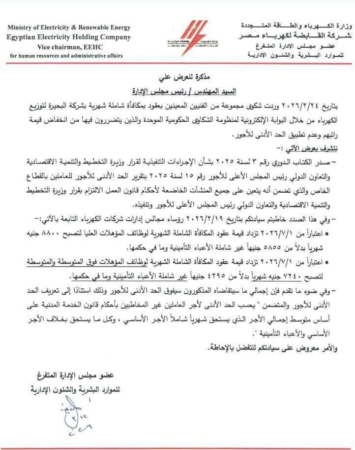 وأوضحت المذكرة، الموجهة لرؤساء مجالس إدارات شركات الكهرباء، أنه تم دراسة الشكاوى الواردة عبر منظومة الشكاوى الحكومية الموحدة، في ضوء القرارات المنظمة الصادرة عن المجلس القومي للأجور ووزارة التخطيط والتنمية الاقتصادية، والتي تقضي بتطبيق الحد الأدنى للأجور على العاملين الخاضعين لقانون العمل.