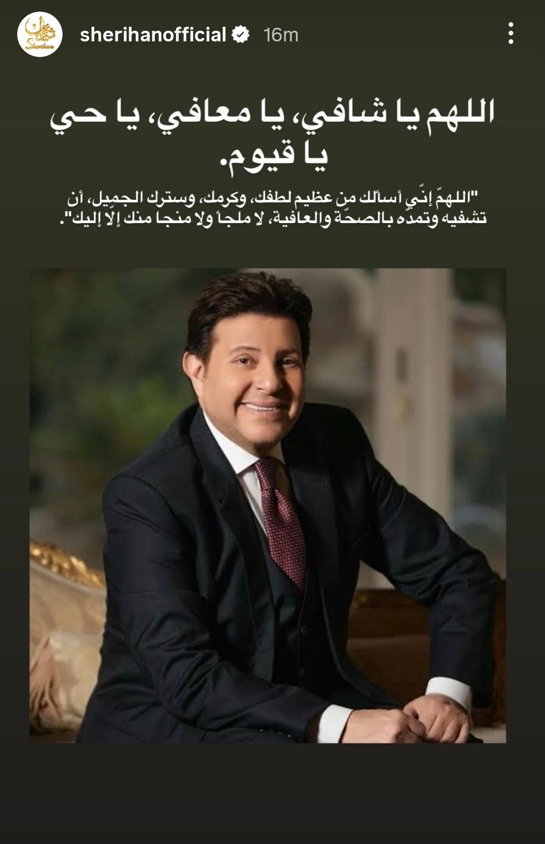 ونشرت شريهان عبر حساباتها الرسمية دعاءً مؤثرًا رصده موقع تحيا مصر، قالت فيه: اللهم يا شافي يا معافي يا حي يا قيوم، اللهم إني أسألك من عظيم لطفك وكرمك وسترك الجميل أن تشفيه وتمده بالصحة والعافية، لا ملجأ ولا منجا منك إلا إليك.
