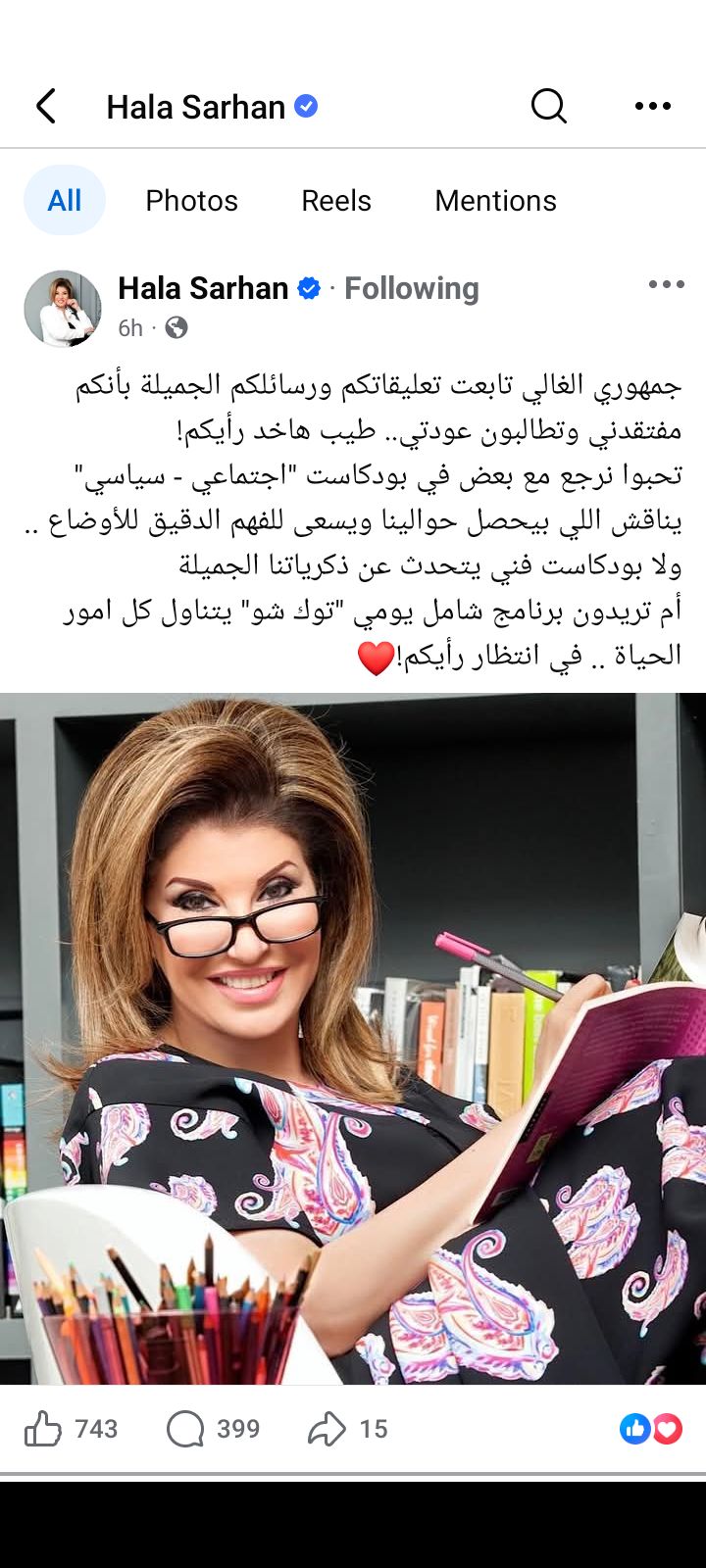 وقالت هالة سرحان في منشور رصده موقع تحيا مصر على حسابها الرسمي بموقع التواصل الاجتماعي فيسبوك: جمهوري الغالي تابعت تعليقاتكم ورسائلكم الجميلة بأنكم مفتقدني وتطالبون عودتي.. طيبة هاخد رأيكم!.