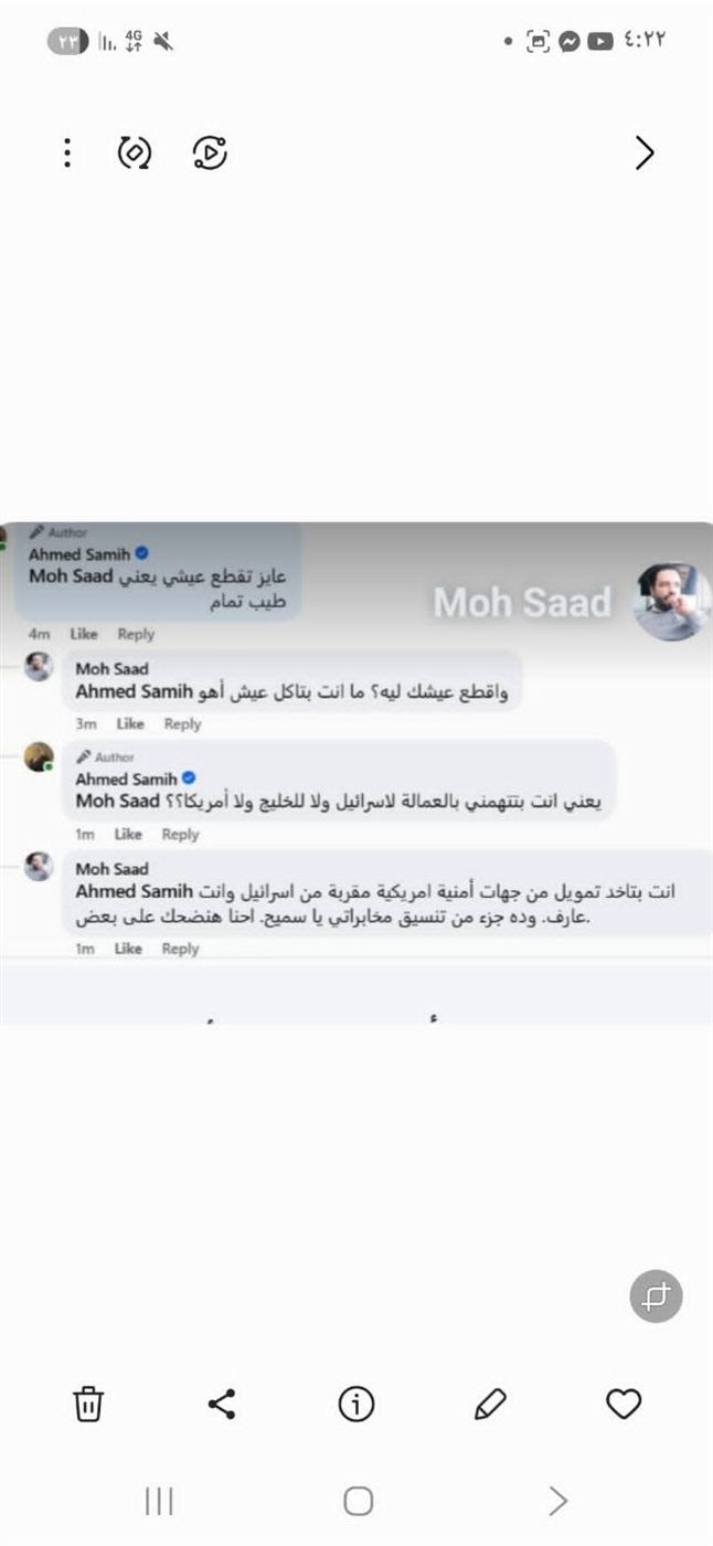 وأكد سعيد في منشوره أن هذه التمويلات تمثل "فضيحة كبرى" تكشف عن حجم التناقض داخل خطاب الجماعة، الذي يرفع شعارات العداء، بينما يتورط في علاقات وتمويلات مع أطراف دولية متناقضة، ليرد عليه سميح معلقا: «عاوز تقطع عيشي يعني.. طيب تمام»، ليهاجمه سعيد قائلا: «أنت بتاخد تمويل من جهات أمريكية مقربة من إسرائيل ومن منظمة تسامح وأنت عارف كده، مش هنضحك على بعض».