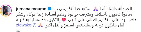 وشاركت “جومانة مراد” صورة لها عبر حسابها الرسمي على انستجرام من خلال التكريم وعلقت معربة عن سعادتها بهذه اللحظة قائلة: “الحمدلله دائمًا وأبدًا، ممتنة جدًا لهذا التكريم وتشرفت بالدعم الكبير من أستاذة زينة توكل، شكر خاص لها على هذه اللفتة الغالية على قلبي”.
