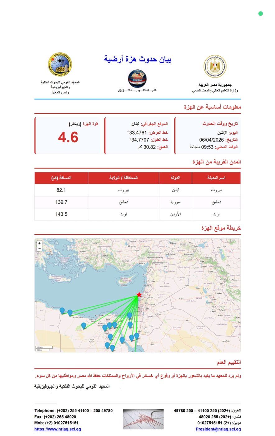 وقال معهد الفلك في بيان أصدره الدكتور طه رابح، رئيس المعهد، إن الهزة الأرضية وقعت في لبنان في التاسعة و53 دقيقة صباحًا بتوقيت القاهرة، وبلغت قوتها 4.6 درجة على مقياس الزلازل، وعلى عمق 30 كيلومتر.