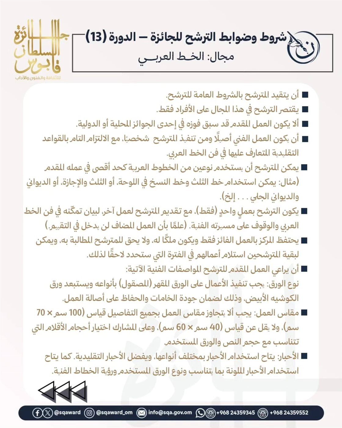 أعلنت جائزة السلطان قابوس للثقافة والفنون والآداب شروط وضوابط الترشح في مجال الخط العربي ضمن الدورة الثالثة عشرة للجائزة في إطار حرصها على دعم الفنون العربية الأصيلة وتشجيع المبدعين في مختلف المجالات الثقافية والفنية، مع الحفاظ على القواعد الكلاسيكية لفن الخط العربي الذي يعد أحد أبرز الفنون المرتبطة بالهوية الحضارية العربية والإسلامية.