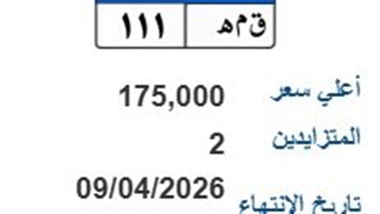 ومن بين اللوحات التي تُجرى المزايدة عليها، لوحة تحمل رقم (ق م ه- 111)، ووصل سعرها حتى الآن إلى 175 ألف جنيه، على أن تنتهي المزايدة عليها في 9 أبريل 2026 ويتزايد عليها شخصين.
