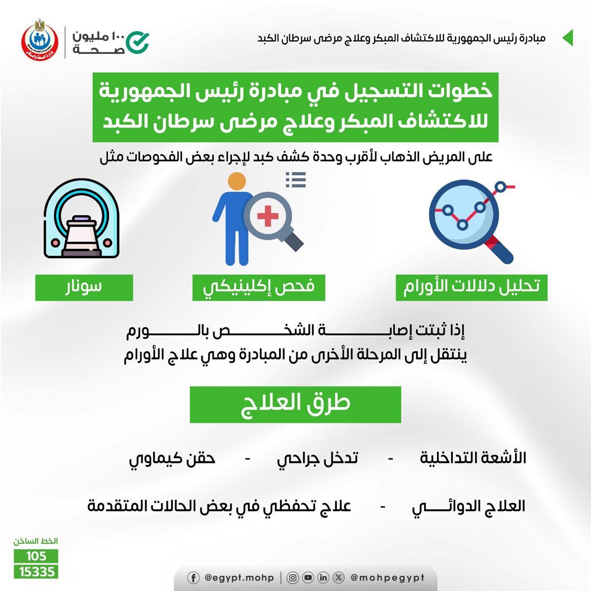 وأوضحت الوزارة أن المبادرة تستهدف الكشف المبكر عن سرطان الكبد من خلال منظومة متكاملة من الفحوصات الطبية الدقيقة، بما يسهم في تحسين فرص العلاج وتقليل المضاعفات، خاصة في المراحل الأولى من المرض.