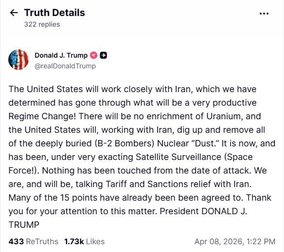 وأضاف ترامب أن الولايات المتحدة ستواصل مناقشة موضوع تخفيف الرسوم والعقوبات مع إيران، مؤكدًا أن العديد من النقاط الخمسة عشر قد تم الاتفاق عليها بالفعل، واختتم ترامب تدوينته بشكر المتابعين على اهتمامهم بهذه القضية.