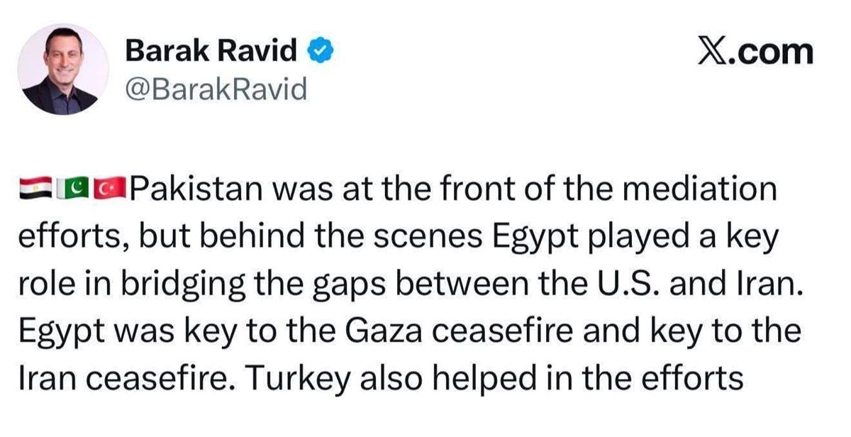 وأفاد الصحفي الأمريكي باراك رافيد مراسل موقع "أكسيوس" الأمريكي والمقرب من الرئيس الأمريكي دونالد ترامب، بأن الجهود الدبلوماسية التي قادت إلى وقف إطلاق النار بين الولايات المتحدة وإيران شهدت مشاركة عدة أطراف إقليمية، حيث تصدرت باكستان واجهة الوساطة بشكل علني، بينما لعبت مصر دورًا محوريًا خلف الكواليس في تقريب وجهات النظر بين الجانبين.