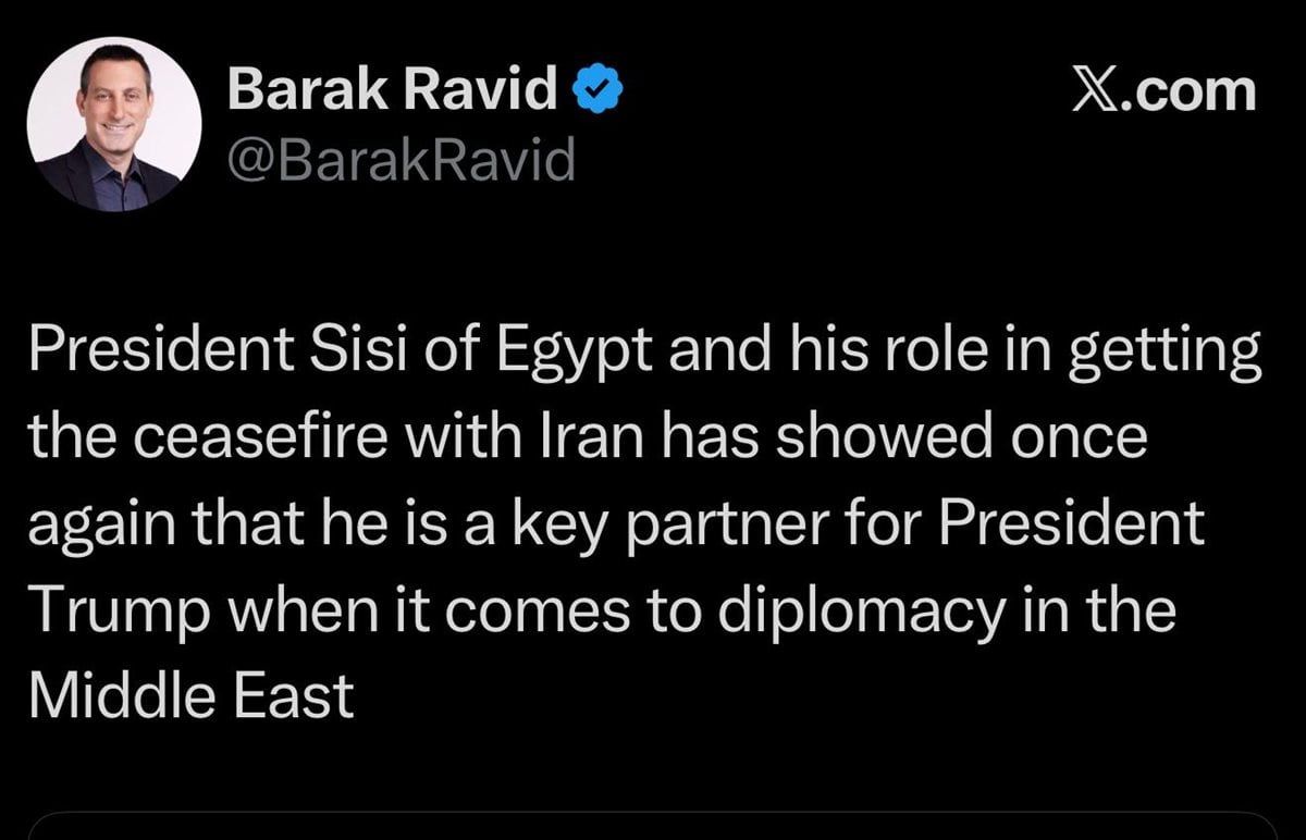 وقال باراك رافيد، في منشور له على منصة "إكس"،: "أظهر الرئيس عبدالفتاح السيسي ودوره في الحصول على وقف إطلاق النار مع إيران، مرة أخرى، أنه شريك رئيسي للرئيس ترامب عندما يتعلق الأمر بالدبلوماسية في الشرق الأوسط".