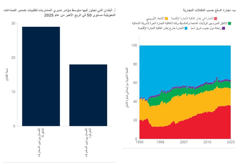 وأشار التقرير إلى أنه في الربع الأخير من عام 2025، سجل نحو 30% من البلدان ذات الصادرات المتنوعة مؤشر مديري مشتريات للصناعات التحويلية فوق مستوى 50، مقابل 18% فقط لدى الدول ذات قاعدة التصدير المحدودة، ما يعكس توسع الطلبات عالميًا.