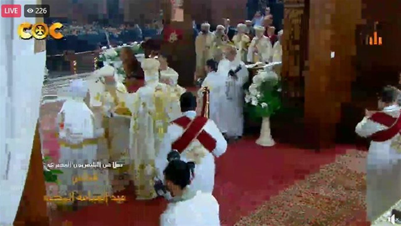 ويدخل البابا تواضروس الثاني إلى الكنيسة الكبري بالكاتدرائية المرقسية بالعباسية، على ألحان وتراتيل الشمامسة.