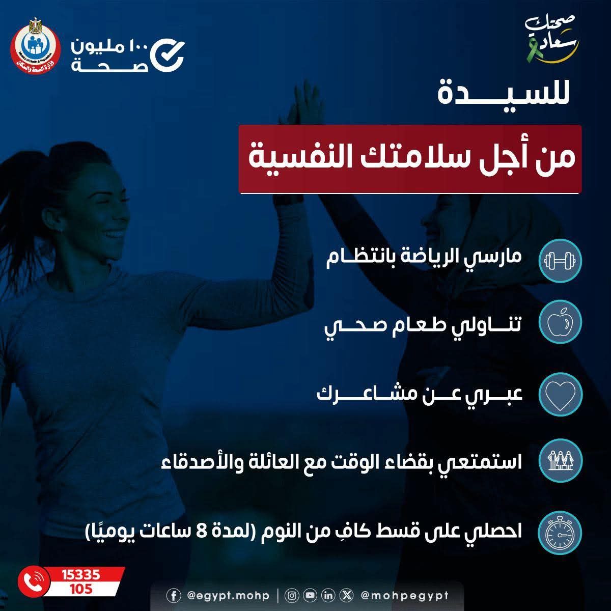 واختتمت الوزارة بالتأكيد على أن صحتك النفسية هي أساس سعادتك وقوتك كل يوم، داعية المواطنين إلى الاهتمام بأنفسهم وعدم التردد في طلب المساعدة عند الحاجة.