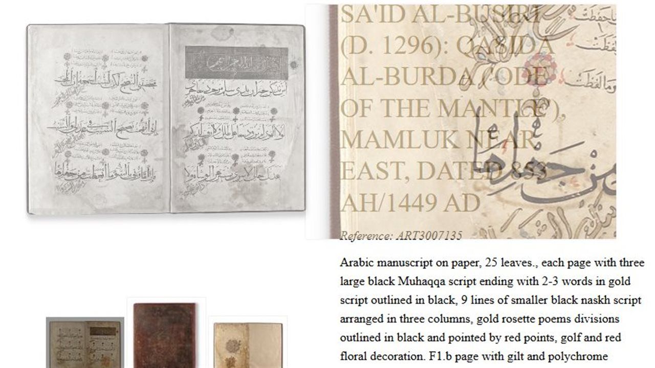 وبحسب موقع Oriental Art Auctions، وهو موقع متخصص في بيع المخطوطات والتحف الإسلامية والشرقية؛ فان مخطوط قصيدة "البُردة" للإمام محمد بن سعيد البوصيري، ويفتح المزاد 120 ألف يورو.