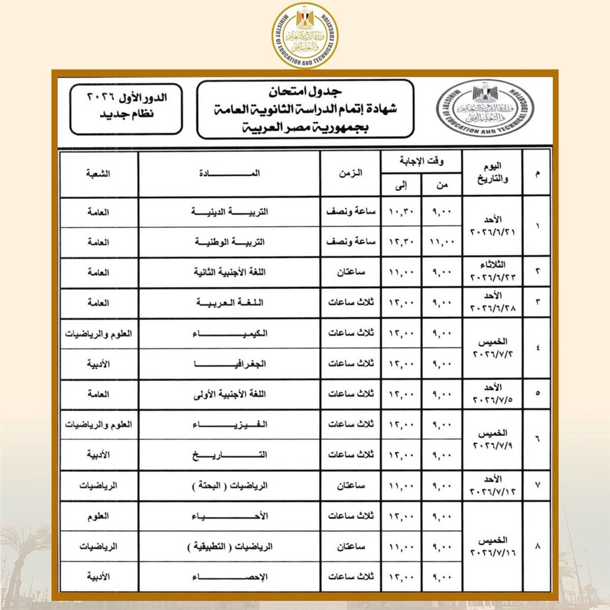 جاء توزيع المواد الأساسية في جدول الثانوية العامة 2026 بشكل متوازن، حيث: