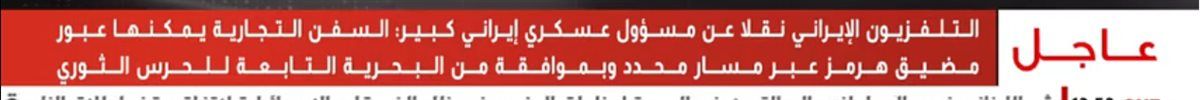 أفاد التلفزيون الإيراني نقلًا عن مسؤول عسكري كبير أن السفن التجارية يمكنها عبور مضيق هرمز عبر مسار محدد وبموافقة من البحرية التابعة للحرس الثوري الإيراني، وذلك في إطار تنظيم حركة الملاحة وضمان سلامتها؛ وفقًا لنبأ عاجل لقناة «القاهرة الإخبارية».