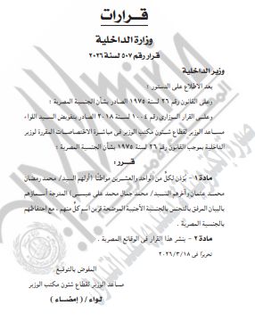وجاء القرار رقم 507 لسنة 2026 استنادًا إلى أحكام الدستور والقانون رقم 26 لسنة 1975 الخاص بالجنسية المصرية، إلى جانب القرار الوزاري رقم 1004 لسنة 2018 بشأن تفويض بعض اختصاصات وزير الداخلية.