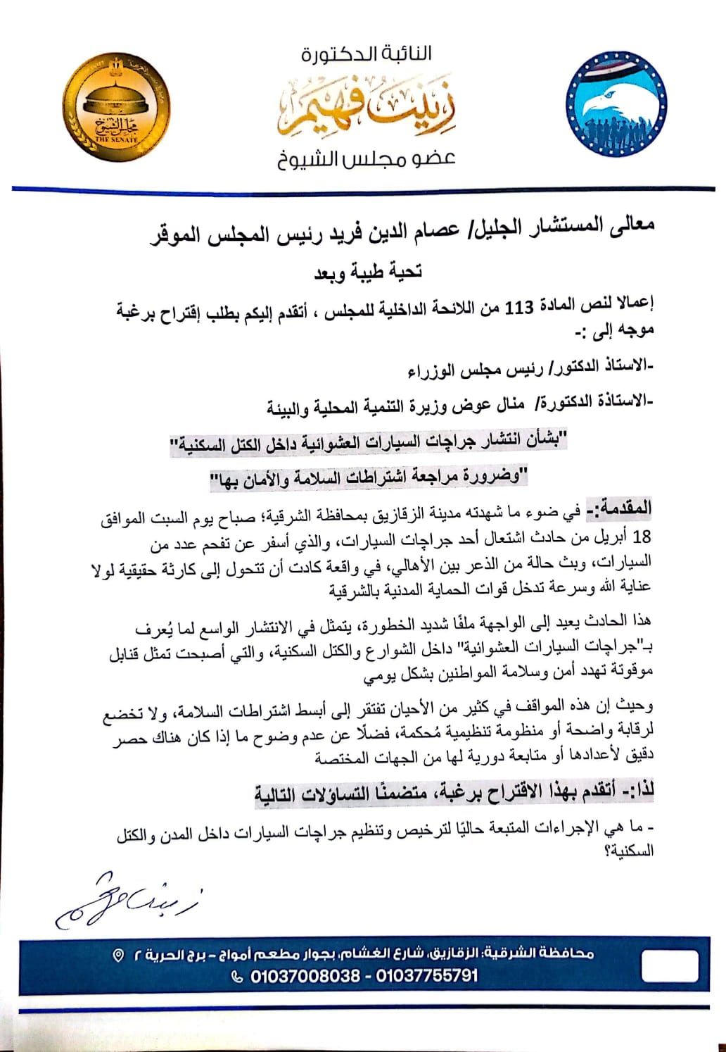 تقدمت النائبة الدكتورة زينب فهيم، عضو مجلس الشيوخ، أمين المرأة عن حزب مستقبل وطن بالشرقية، بطلب اقتراح برغبة موجه إلى الدكتور مصطفى مدبولي رئيس مجلس الوزراء، والدكتورة منال عوض وزيرة التنمية المحلية والبيئة، بشأن ضرورة مراجعة وتنظيم أوضاع الجراجات ومواقف السيارات داخل الكتل السكنية، في ضوء ما شهدته مدينة الزقازيق صباح اليوم من حادث اشتعال جراج سيارات بمنطقة الغشام، والذي أسفر عن احتراق عدد من السيارات، وبث حالة من الذعر بين الأهالي.