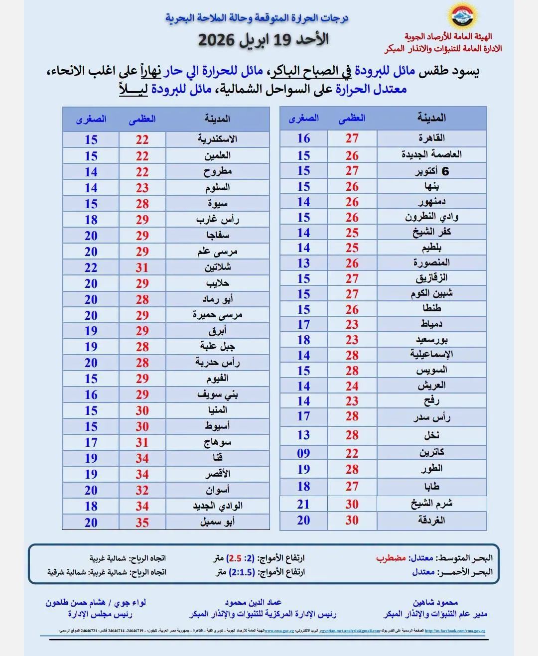وأكدت الهيئة أن درجات الحرارة العظمى المتوقعة على القاهرة الكبرى تسجل نحو 27 درجة مئوية، في ظل أجواء متقلبة نسبيًا تتطلب توخي الحذر خاصة على الطرق السريعة والزراعية.