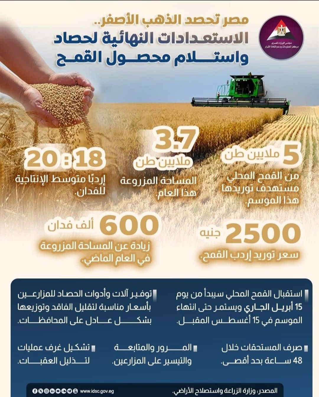 أكد مركز المعلومات ودعم اتخاذ القرار في مجلس الوزراء مواصلة الاستعدادات لإنجاح موسم حصاد القمح ورفع كفاءة الخدمات الزراعية المقدمة للمزارعين، حيث أعلنت وزارة الزراعة واستصلاح الأراضي الاستعدادات النهائية لبدء موسم حصاد وتوريد القمح المحلي، بجميع محافظات الجمهورية.