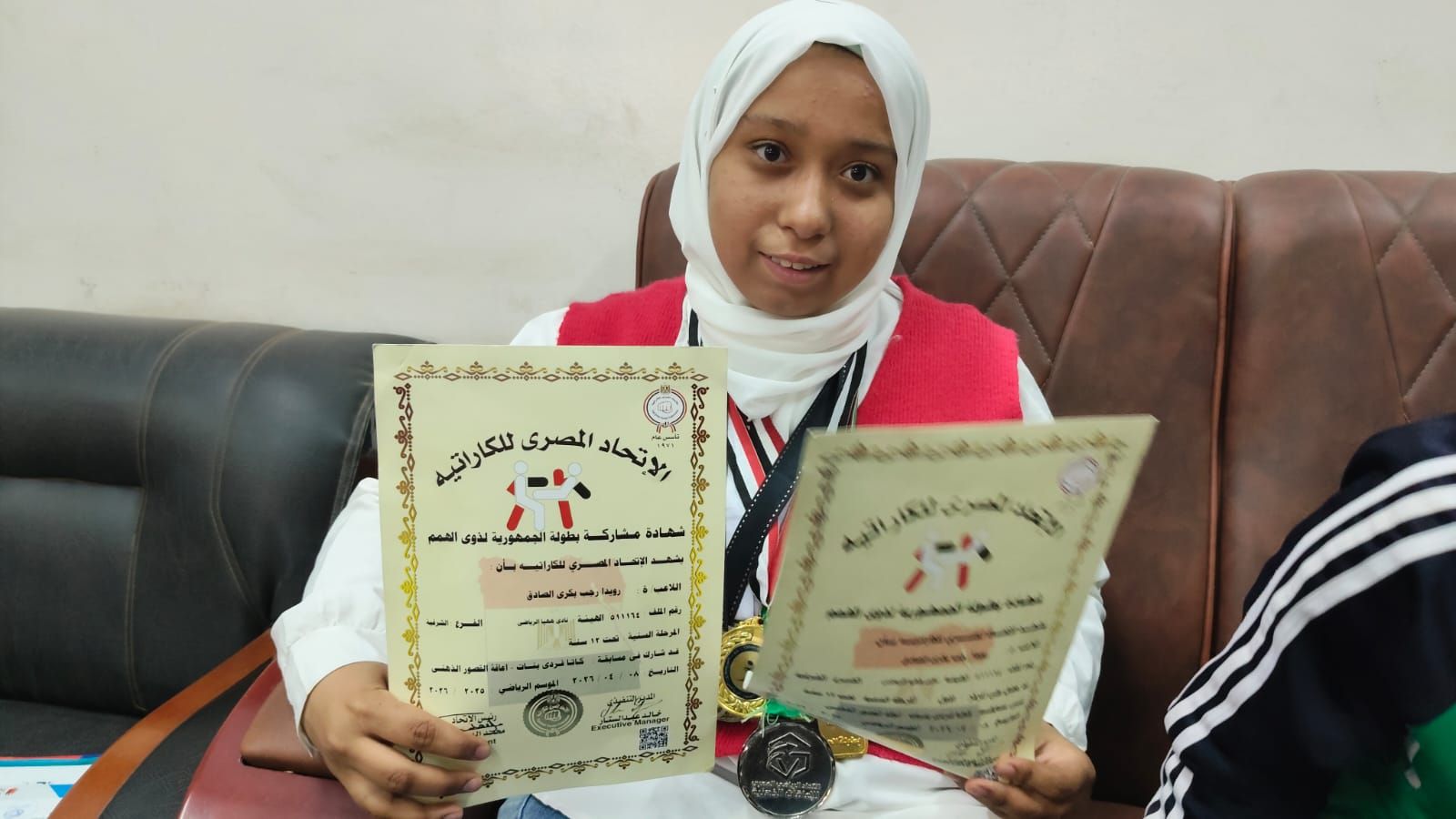 فازت اللاعبة «رويدا رجب بكري» صاحبة الـ 14 عاما طالبة بالصف الثاني الاعدادي ومقيمة بمدينة ههيا بمحافظة الشرقية، بالمركز الأول في بطولة الجمهورية في الكاراتيه لذوي الهمم، والتي أقيمت في الصالة المغطاة بجامعة حلوان.