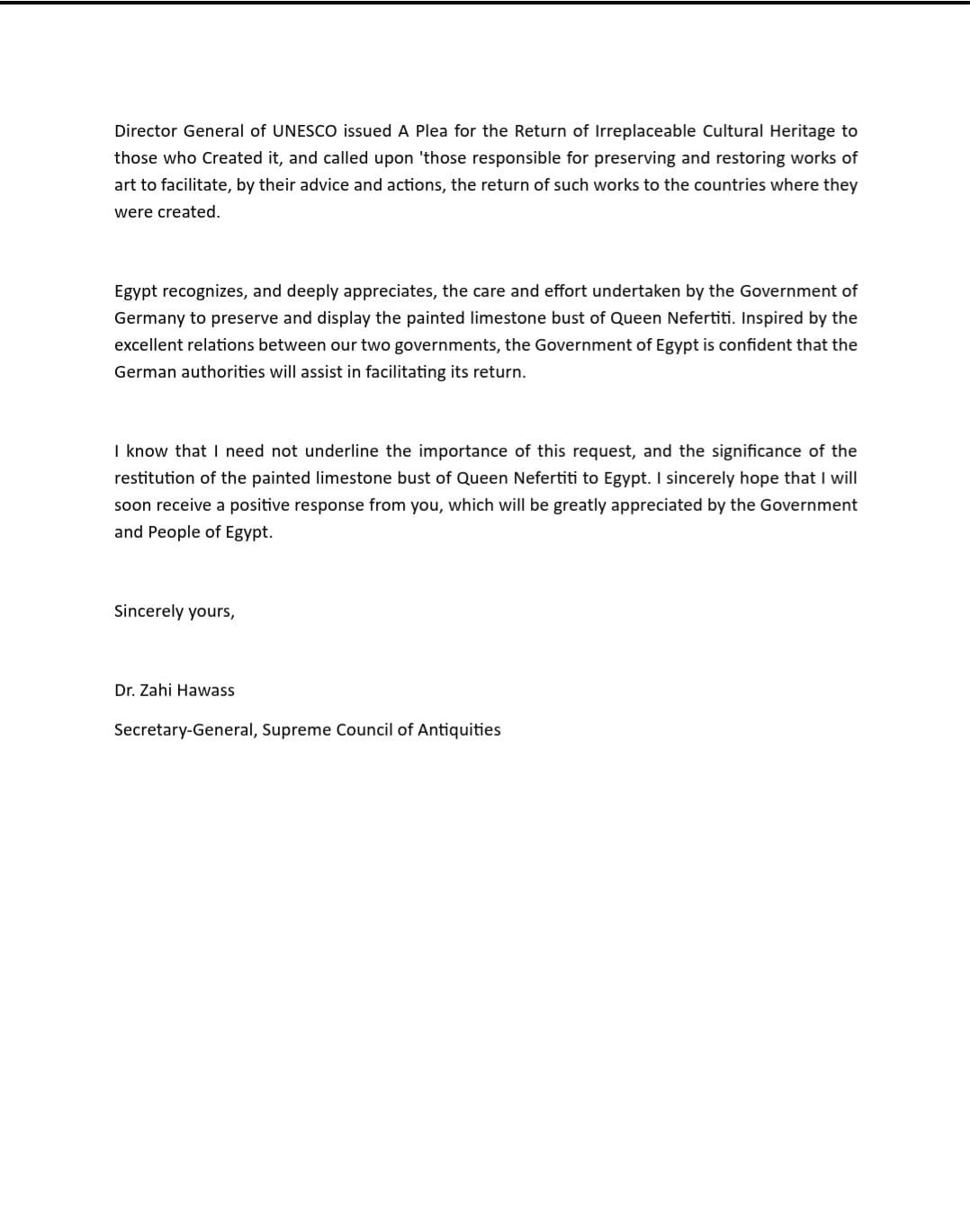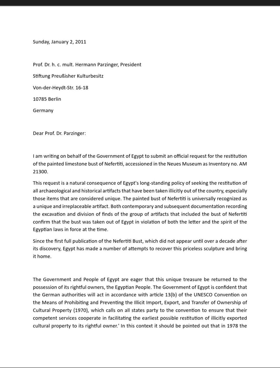وأكد حواس في خطابه أنه طالب رسميًا باسترداد القطعة المسجلة برقم AM 21300 والموجودة في المتحف الجديد ببرلين، مشددًا على أنها قطعة فريدة لا يمكن تعويضها، وأن مكانها الطبيعي هو مصر.