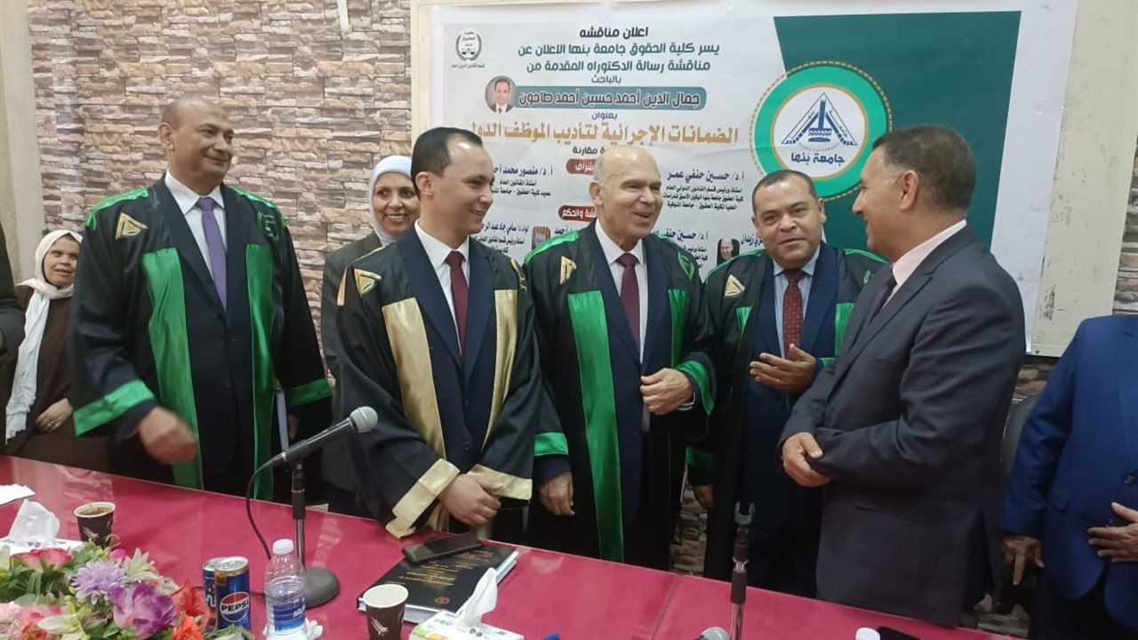 وأكد الباحث عقب إعلان حصوله على درجة الدكتوراه توجيه الشكر لأسرته وعائلته وأسرة جامعة بنها وكلية الحقوق وقيادات محافظة القليوبية على دعمه وتشجيعه ومساندته مشيرا أنه تعد رسالة الدكتوراه تحت عنوان "الضمانات الإجرائية لتأديب الموظف الدولي" من الموضوعات الحيوية والمؤثرة في قانون الوظيفة العامة الدولية، حيث تسعى لموازنة كفتي الميزان بين سلطة المنظمة الدولية في الحفاظ على الانضباط والمرفق العام، وحق الموظف الدولي في الحماية من التعسف.