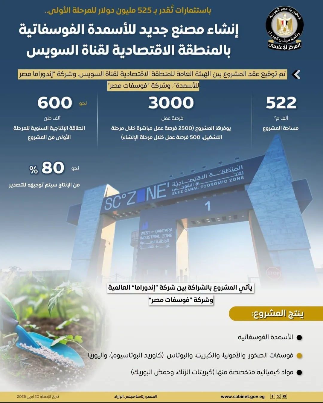 وسلط المركز الإعلامي لمجلس الوزراء الضوء على مشروع شركة "إندوراما مصر للأسمدة"، بمنطقة السخنة الصناعية، والذي يمثل إضافة نوعية لقطاع الصناعات الاستراتيجية في مصر، خاصة في مجال الأسمدة والصناعات المرتبطة بالثروات التعدينية.