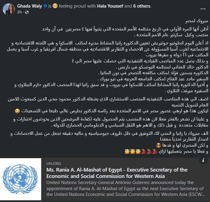 يأتي تعيين الدكتورة رانيا المشاط وكيلًا للأمين العام وأمينًا تنفيذيًا للجنة الاقتصادية والاجتماعية لغربي آسيا "الإسكوا"، ليضيف اسمًا جديدًا إلى قائمة المصريين الذين يشغلون هذا المنصب الرفيع، ويرفع عددهم إلى أربعة في سابقة هي الأولى من نوعها في تاريخ المنظمة الأممية.