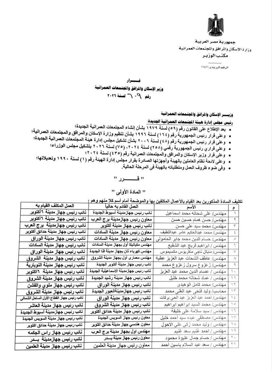 وشمل القرار عددًا من المدن، من بينها: السادس من أكتوبر، وحدائق أكتوبر، والسادات، والشروق، والعبور الجديدة، والعلمين الجديدة، ضمن خطة تستهدف تعزيز كفاءة منظومة العمل داخل أجهزة المدن.