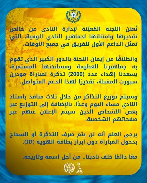 أعلنت اللجنة المعينة المؤقتة المسئولية عن إدارة نادي الإسماعيلي، عن توفير 2000 تذكرة مجانية للجماهير أمام فريق مودرن سبورت، في مجموعة الهبوط بدوري نايل (موسم 2025/2026).