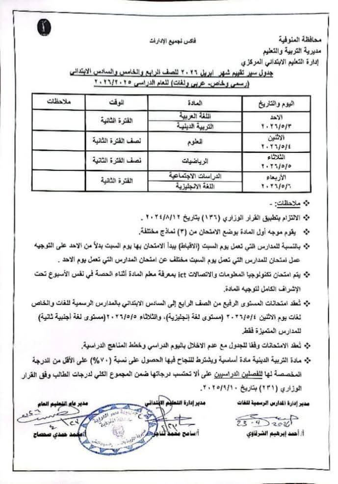 من المتوقع أن يتم تعميم تعديل جدول امتحانات شهر أبريل 2026 على باقي المحافظات خلال الساعات والأيام المقبلة، بعد مراجعة الإدارات التعليمية للجداول النهائية واعتمادها رسميًا.