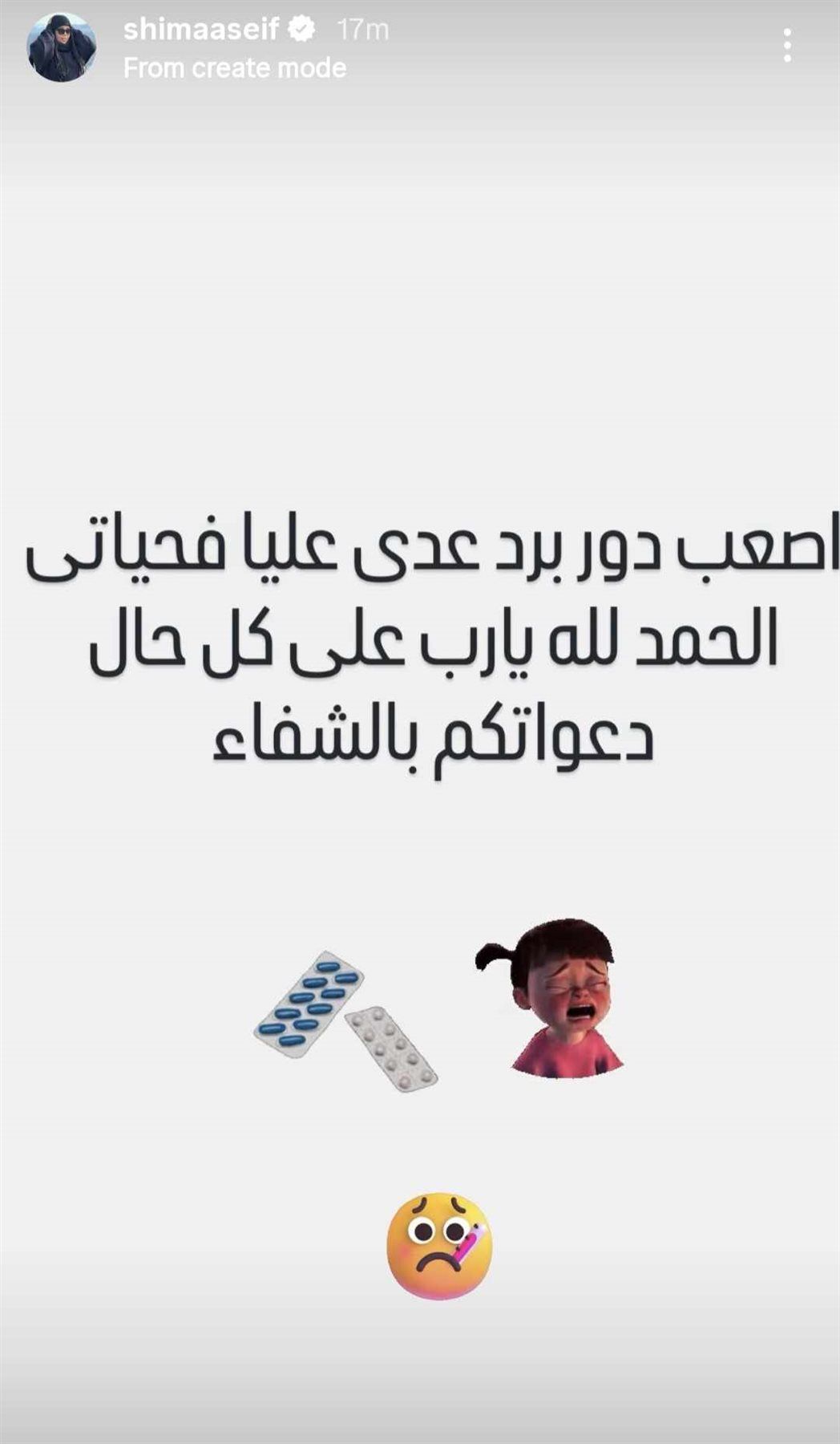 وقالت شيماء في منشور لها رصده موقع تحيا مصر: "أصعب دور برد عدى عليا في حياتي، الحمد لله يا رب على كل حال، دعواتكم بالشفاء"، في إشارة إلى شدة الأعراض التي تعاني منها خلال الأيام الماضية.