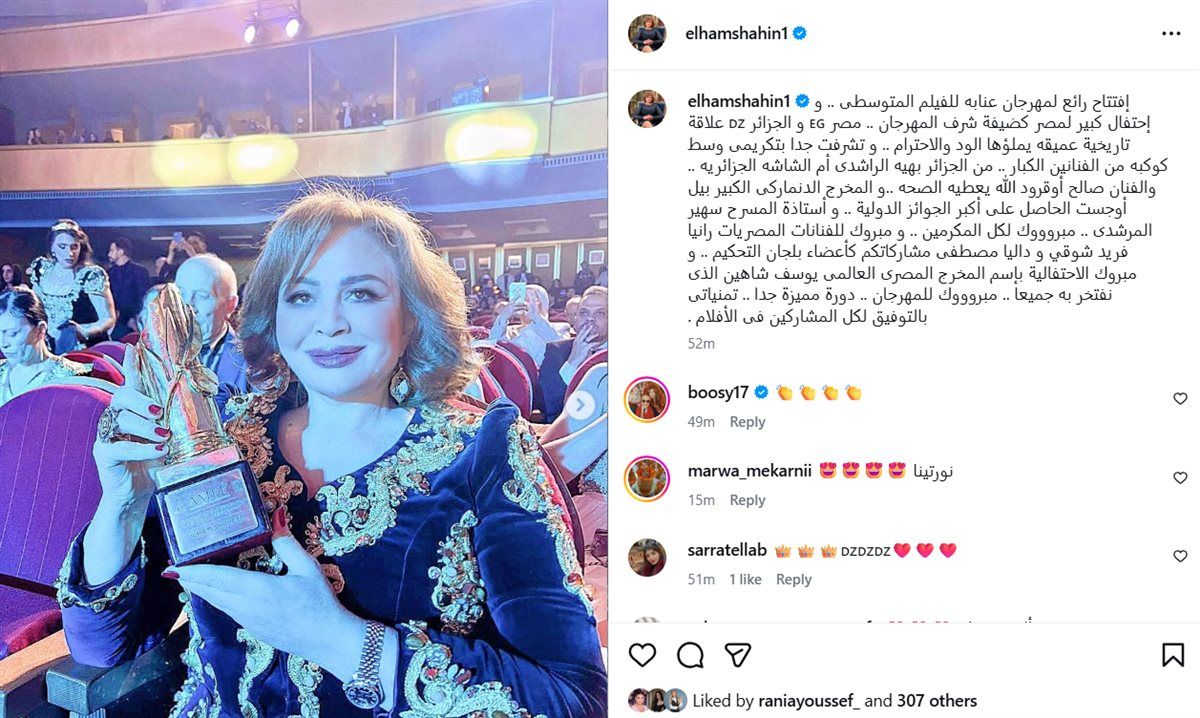 ونشرت إلهام شاهين عبر حسابها على إنستجرام تعليقًا عبّرت فيه عن فخرها بالمشاركة في هذا الحدث، مشيدةً بحفاوة الاستقبال والتنظيم، ومؤكدةً اعتزازها بتكريمها إلى جانب شخصيات بارزة مثل بهية راشدي، وصالح أوقروت، والمخرج العالمي بيل أوجست، إلى جانب الفنانة سهير المرشدي.