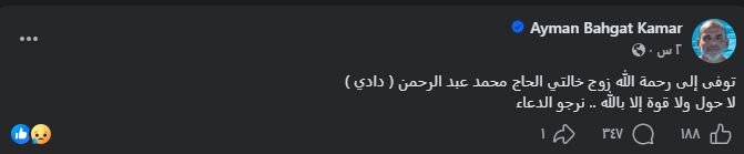 وكتب الشاعر أيمن بهجت قمر، منشورا يعلن خلاله وفاة زوج خالته، وففقا لما رصده موقع تحيا مصر، وذلك عبر صفحته الرسمية على موقع التواصل الاجتماعي إنستجرام، قائلا: تُوفي إلى رحمة الله، زوج خالتي الحاج محمد عبد الرحمن (دادي)، لا حول ولا قوة إلا بالله.