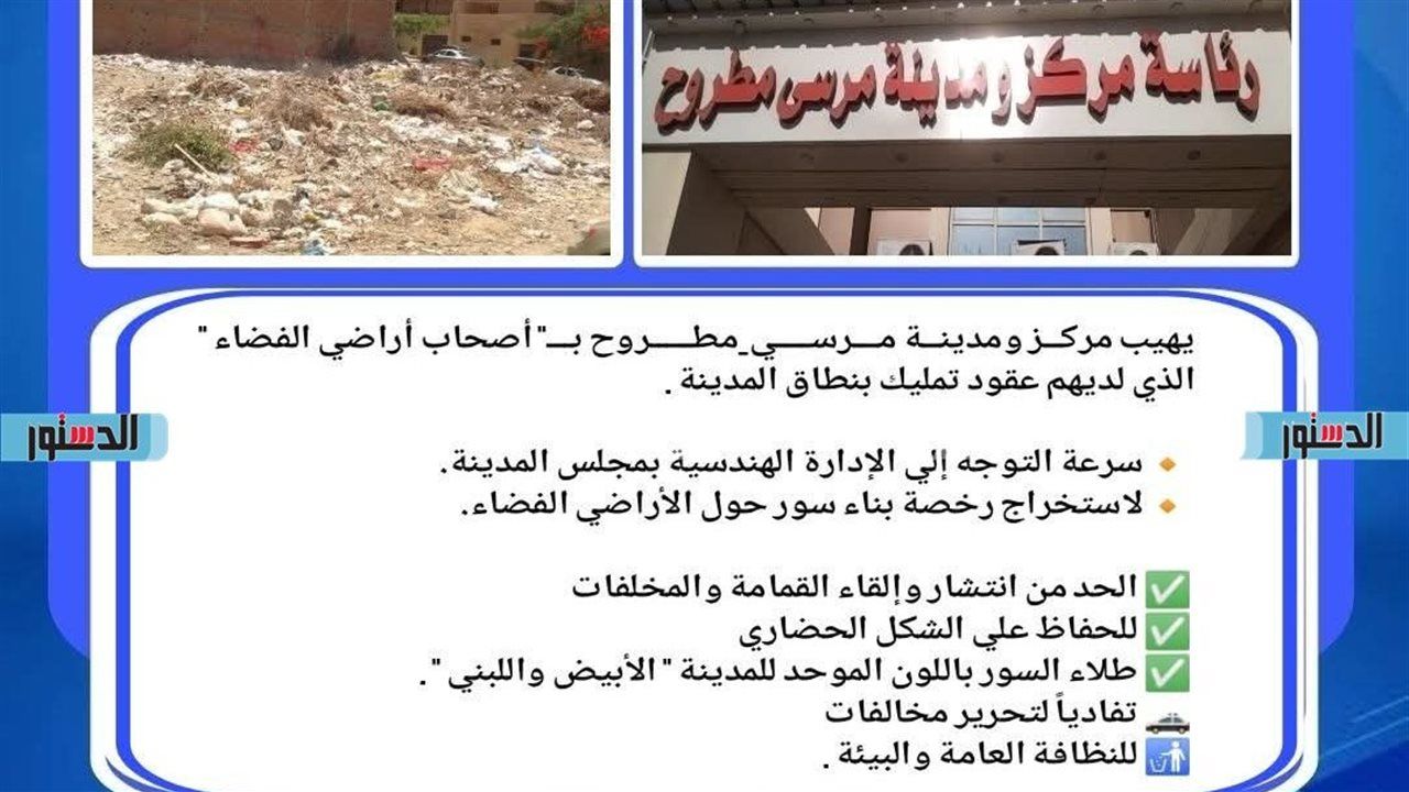 وشددت على ضرورة الالتزام بالاشتراطات المحددة، والتي تتضمن طلاء الأسوار باللون الموحد المعتمد داخل المدينة، وهو اللونان الأبيض واللبني، بما يحقق التناسق البصري ويعزز الهوية الجمالية لمطروح.