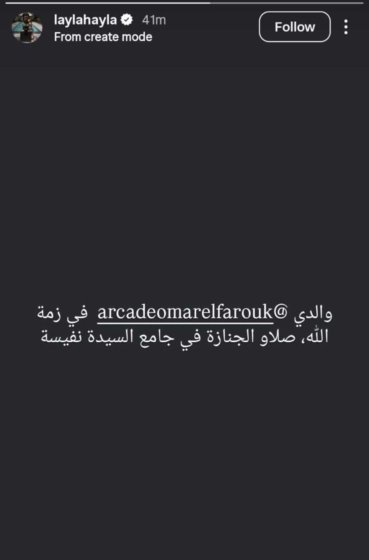 وكشفت ليلى الفاروق في منشورها أن صلاة الجنازة ستُقام في مسجد السيدة نفيسة، مطالبة جمهورها ومحبيها بالدعاء لوالدها بالرحمة والمغفرة، دون الكشف عن مزيد من التفاصيل المتعلقة بظروف الوفاة.