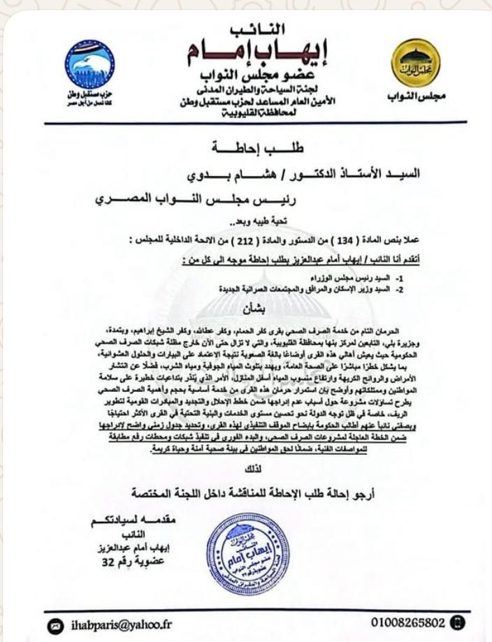 وأوضح النائب، في طلبه المستند إلى نص المادة (134) من الدستور والمادة (212) من اللائحة الداخلية للمجلس، أن عددًا من القرى، وهي: فرسيس، كفر فرسيس، سندنهور، كفر الحمام، كفر عطا الله، كفر الشيخ إبراهيم، بتمدة، وجزيرة بلي التابعة لمركز بنها، لا تزال خارج مظلة شبكات الصرف الصحي الحكومية حتى الآن، رغم الكثافة السكانية واحتياجها الشديد لتلك الخدمة الحيوية.