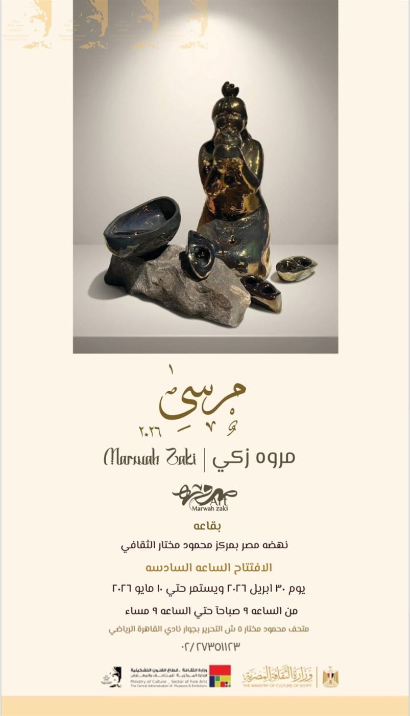 يفتتح الدكتور محمود حامد، رئيس قطاع الفنون التشكيلية، معرضًا فنيًا جديدًا للفنانة مروة زكي بعنوان “مرسى”، وذلك مساء الخميس 30 أبريل 2026، بقاعة “نهضة مصر” داخل مركز محمود مختار الثقافي.