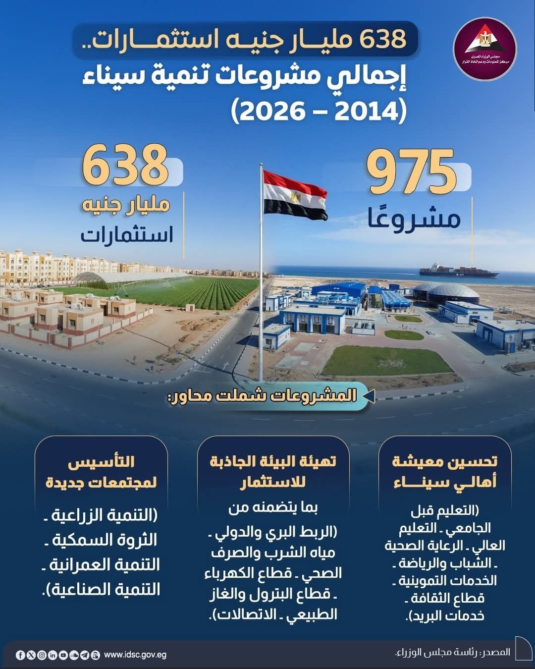كما كشف مركز المعلومات ودعم اتخاذ القرار في مجلس الوزراء، أن نحو 638 مليار جنيه تم استثمارها لتنفيذ 975 مشروعًا لتنمية شبه جزيرة سيناء، شملت محاور تحسين معيشة أهالي سيناء، والتأسيس لمجتمعات جديدة، وتهيئة البيئة الجاذبة للاستثمار.