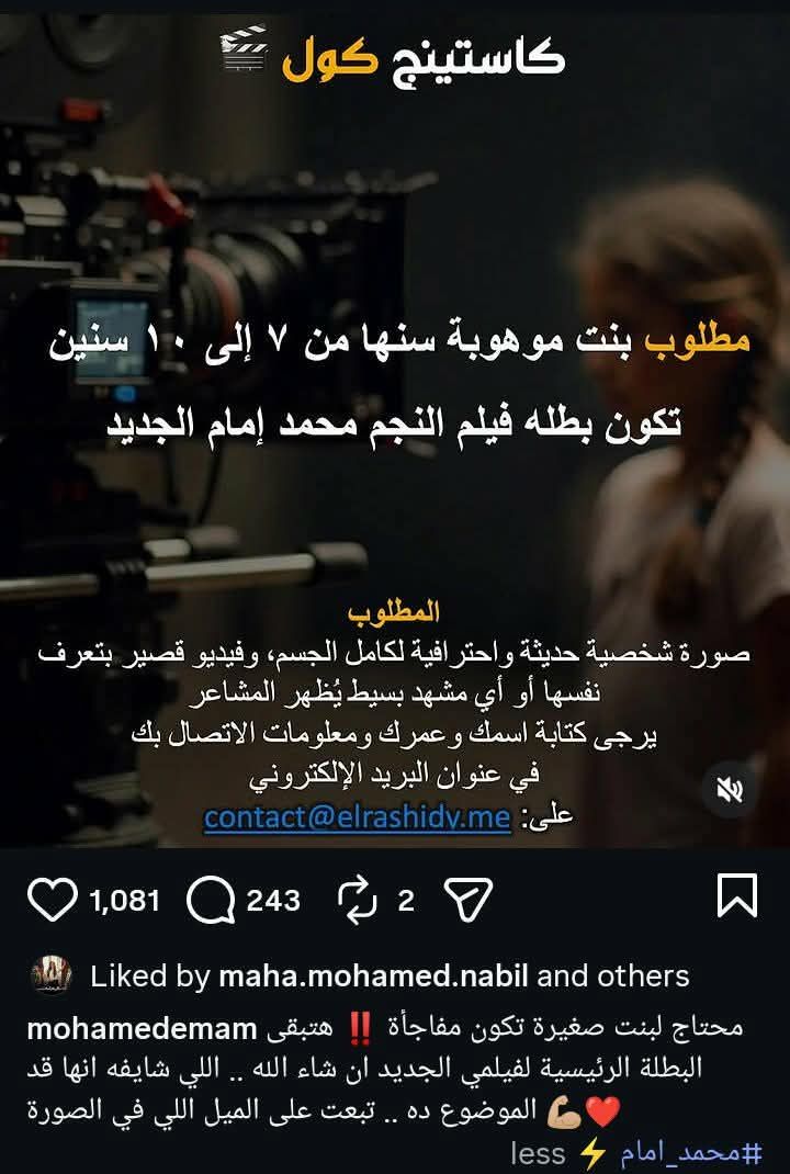 وكتب محمد إمام في منشور رصده موقع تحيا مصر على حسابه بموقع انستجرام: "محتاج لبنت صغيرة تكون مفاجأة، هتبقى البطلة الرئيسية لفيلمي الجديد إن شاءالله، اللي شايفة إنها قد الموضوع ده تبعت على الميل اللي في الصورة".