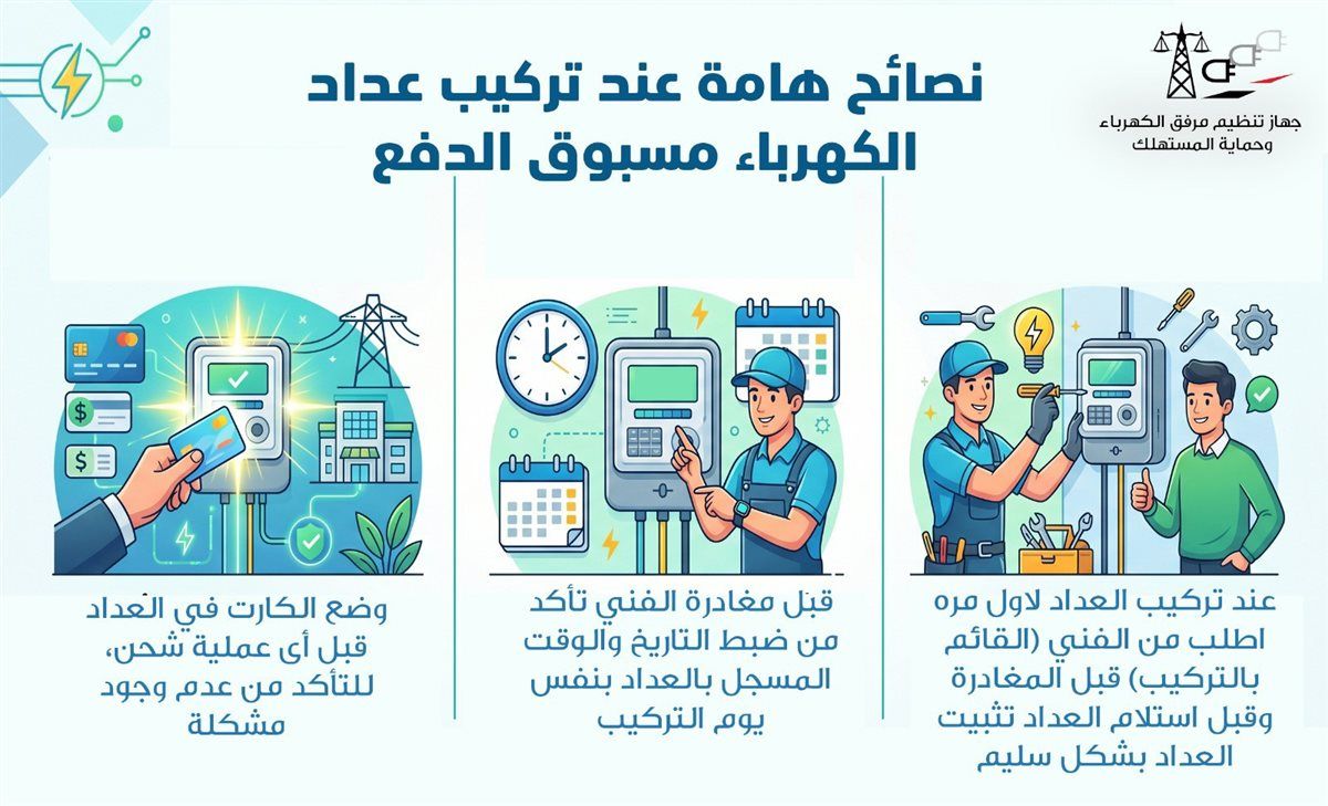 أصدر جهاز تنظيم مرفق الكهرباء وحماية المستهلك مجموعة من الإرشادات الهامة للمواطنين بالتزامن مع التوسع في تركيب عدادات الكهرباء مسبقة الدفع، وذلك بهدف ضمان كفاءة التشغيل وتفادي أي مشكلات فنية أو محاسبية قد تطرأ بعد التركيب.