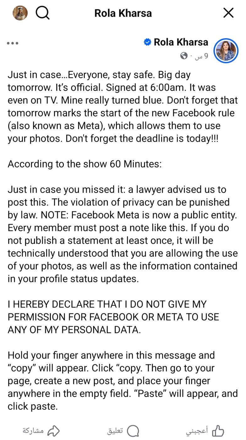 نشر مثل هذا البيان على حسابك الشخصي لا يحمل أي قيمة قانونية أو تقنية، ولا يؤثر على سياسات استخدام البيانات لدى Meta، فالشركة تعمل وفق شروط استخدام وسياسات خصوصية يتم الموافقة عليها عند إنشاء الحساب، وأي تغيير في هذه السياسات يتم الإعلان عنه رسميًا، وليس عبر منشورات منسوخة بين المستخدمين.