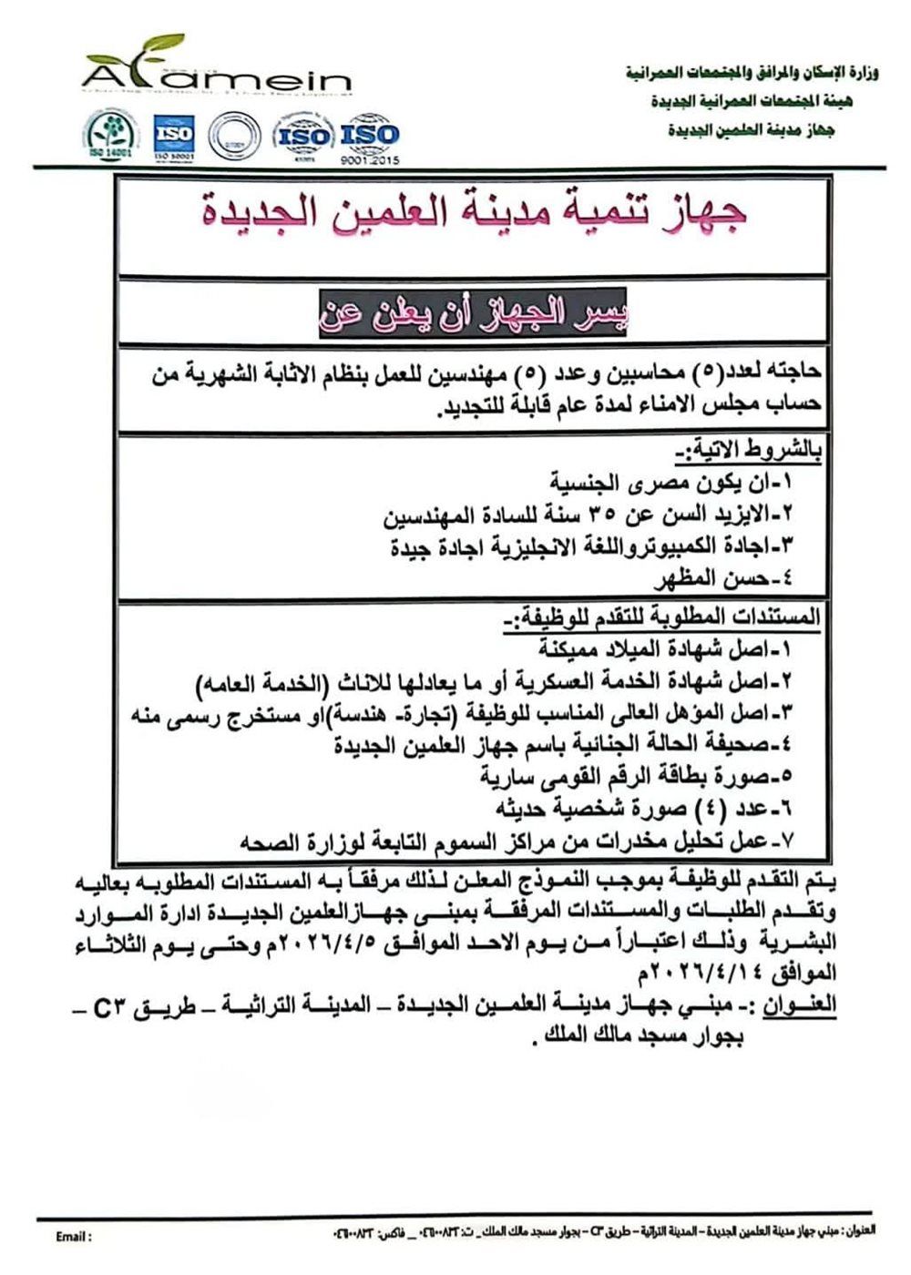 أعلن جهاز تنمية مدينة العلمين الجديدة، عن حاجته لشغل وظائف (5 محاسبين و5 مهندسين) بنظام المكافأة الشهرية، من حساب مجلس الأمناء لمدة عام قابلة للتجديد، على أن يبدأ التقديم في أول الأسبوع المقبل.