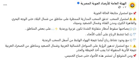 وحذرت الهيئة من تدهور مستوى الرؤية الأفقية على السواحل الشمالية الغربية وشمال الصعيد ومناطق من الصحراء الغربية، نتيجة الأتربة المثارة، مؤكدة ضرورة توخي الحيطة والحذر خاصة لقائدي المركبات.