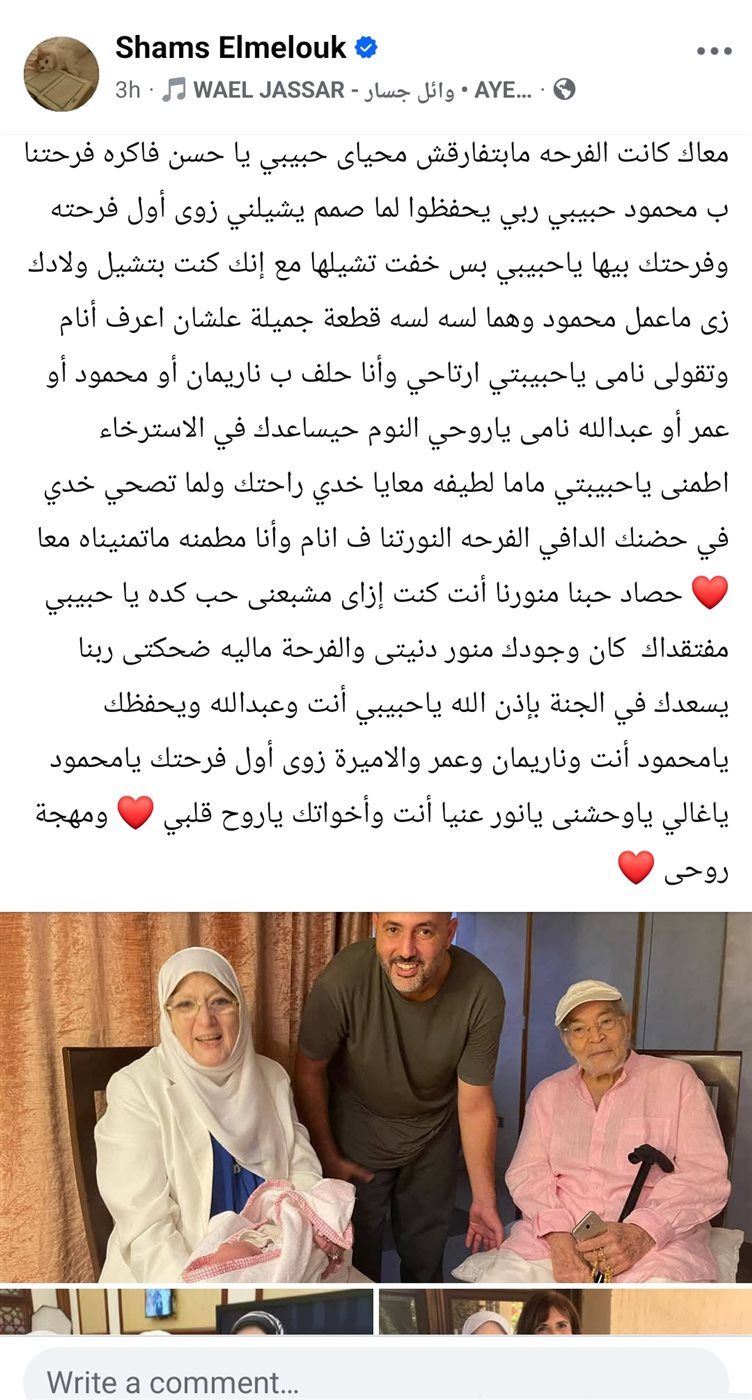وكتبت شمس البارودي بكلمات يغلب عليها الشجن، متحدثة عن تفاصيل حياتها الزوجية وذكرياتها مع أبنائها، خصوصًا لحظات الفرح التي عاشتها مع عائلتها، مشيدة بدور زوجها الفنان الراحل حسن يوسف في دعمها واحتوائها، وما كان يملأ حياتها من حب وطمأنينة.