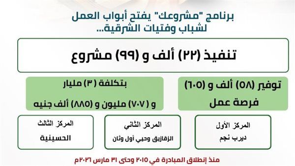 وأعلن حازم الأشموني، محافظ الشرقية، تنفيذ 22 ألفًا و99 مشروعًا منذ انطلاق مبادرة «مشروعك» عام 2015 وحتى 31 مارس 2026، بإجمالي تكلفة بلغت 3 مليارات و707 ملايين و885 ألف جنيه، ما أسهم في توفير 58 ألفًا و605 فرص عمل حقيقية لأبناء المحافظة.
