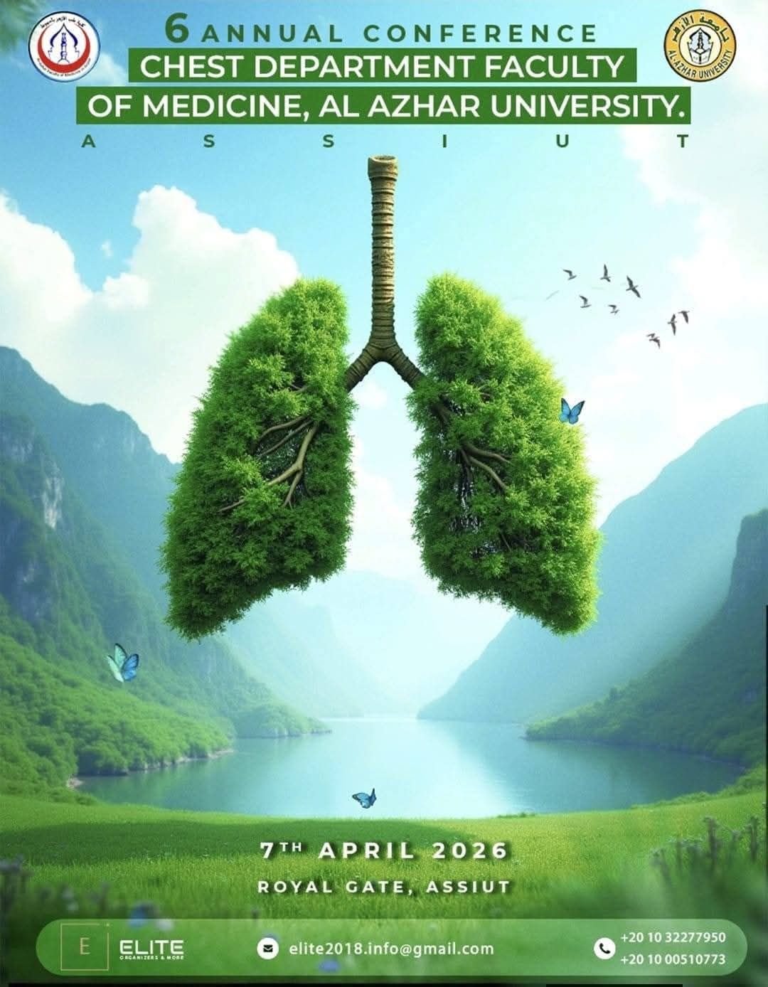 تنطلق فعاليات المؤتمر السادس لقسم الأمراض الصدرية بكلية الطب للبنين بجامعة الأزهر بأسيوط، يوم الثلاثاء القادم وذلك بقاعة رويال جيت بأسيوط، تحت عنوان "آخر المستجدات والتطورات السريرية في طب الرئة – Recent Updates and Clinical Advances in Pulmonary Medicine".