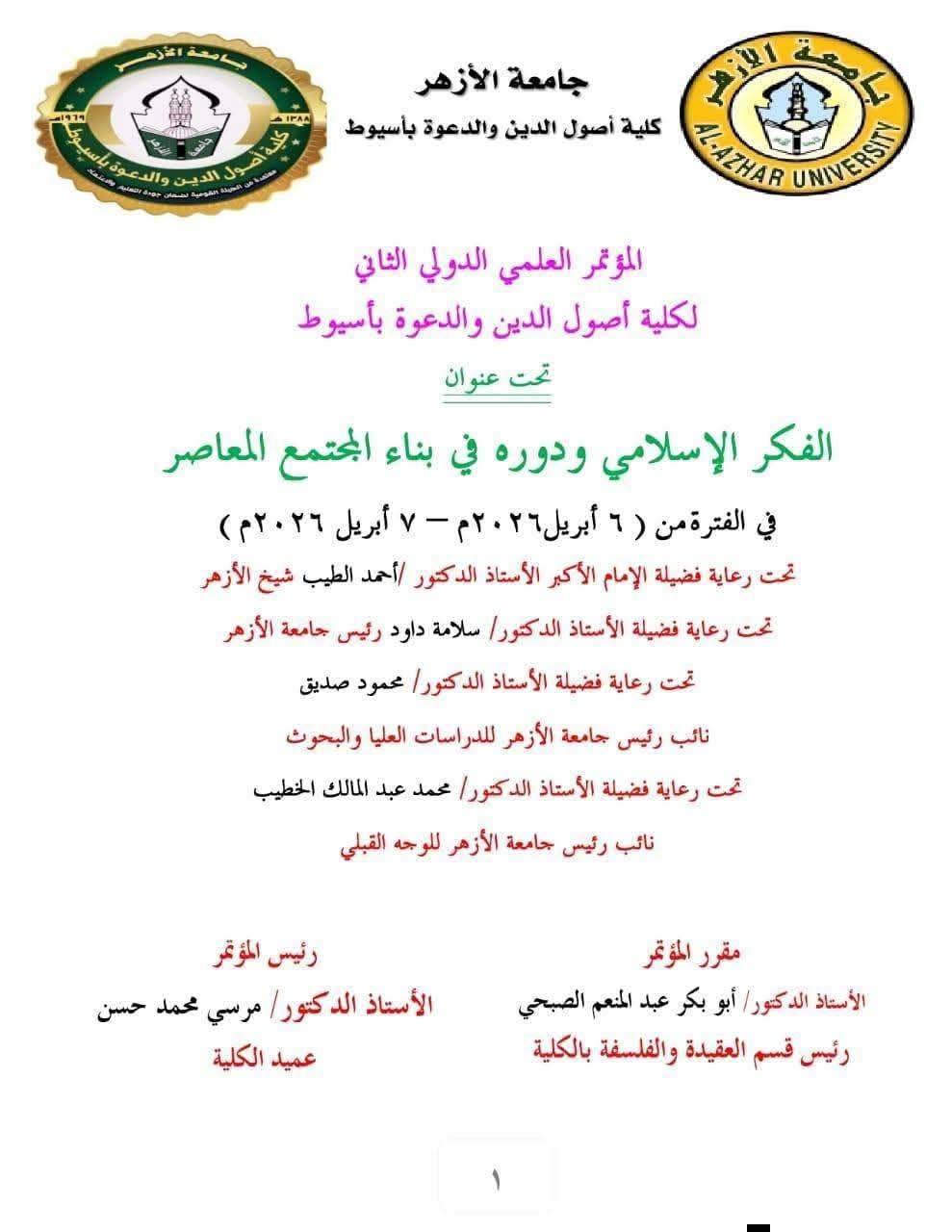 تطلق كلية أصول الدين والدعوة بجامعة الأزهر بأسيوط مؤتمرها العلمي الدولي الثاني بعنوان "الفكر الإسلامي ودوره في بناء المجتمع المعاصر" يومي 6 و7 أبريل 2026، بمشاركة 37 بحثاً علمياً.