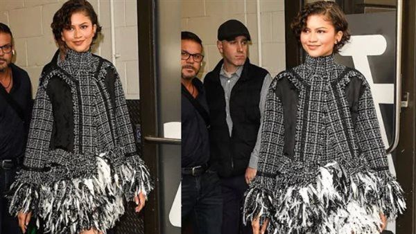 اختارت زيندايا زيًا مميزًا من قماش التويد باللونين الأبيض والأسود، حيث نسّقت سترة مزينة بتفاصيل ناعمة مع تنورة متطابقة، ما أضفى على مظهرها طابعاً كلاسيكياً بلمسة عصرية.
