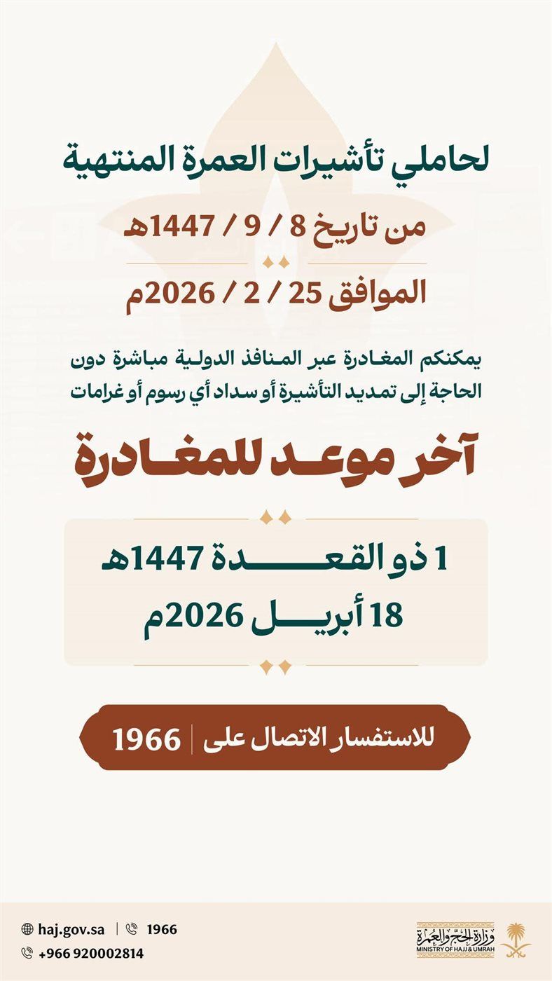 ملاحظة هامة: تدعو وزارة الحج والعمرة جميع المعتمرين المتواجدين حالياً إلى مراجعة تواريخ انتهاء تأشيراتهم والبدء في إجراءات حجز رحلات العودة قبل انتهاء المهلة المحددة لضمان الاستفادة من الإعفاء من الغرامات.